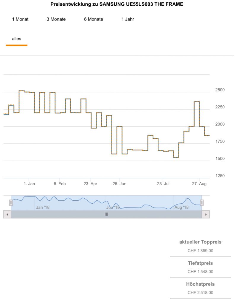 Der 55“ ist hierbei weniger interessant, da es ihn gemäss toppreise im Juli bereits einmal für exakt diesen Preis gab (best price bislang), aktuell ist der zweitbeste Preis bei 1869.- CHF.