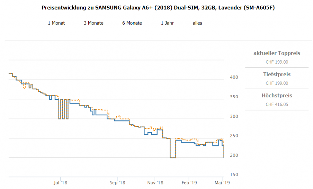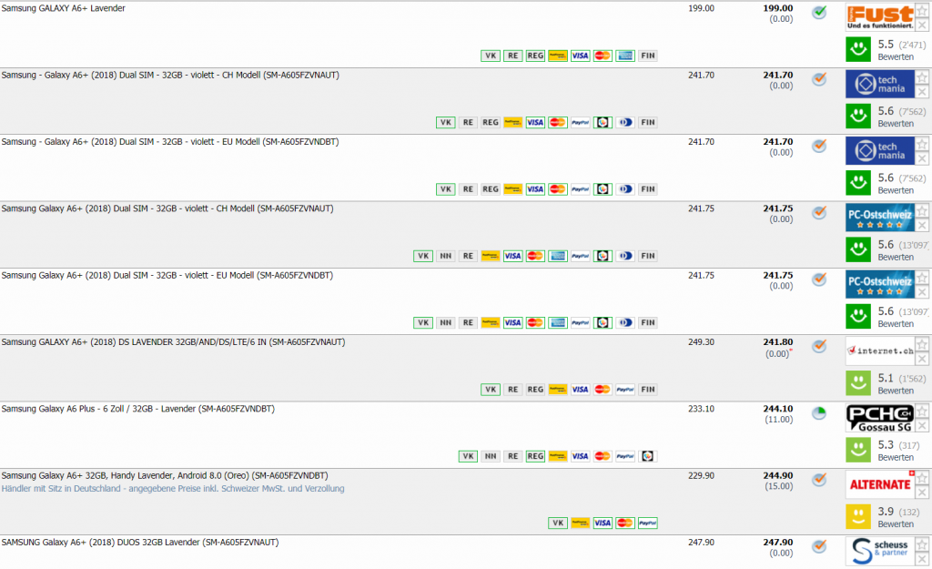 Bei Fust gibt’s das Samsung Galaxy A6+ (2018) Dual-SIM, 32GB für CHF 199.- Mit dem Code 1119RM gibt’s das Gerät sogar für CHF 179.- Zweitbester Preis in der Schweiz liegt derzeit bei CHF 241.70, Bestpreis war ebenfalls bei CHF 179.-