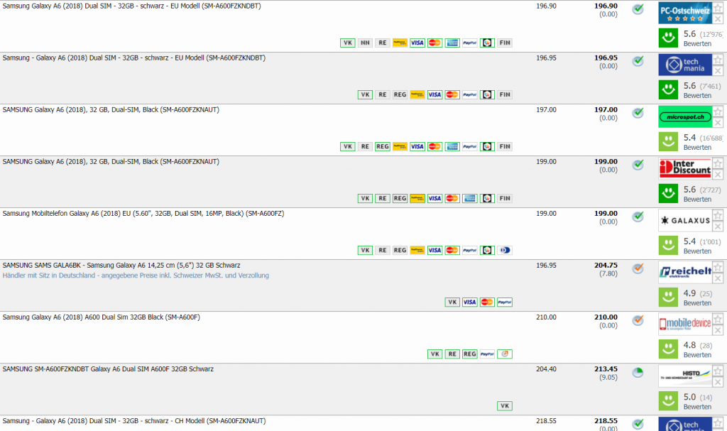 Bei MediaMarkt gibt es gerade das Samsung Galaxy A6 für CHF 169.- Bestprice bisher war bei CHF 179.10, zweitbester Preis im Moment beträgt CHF 196.90