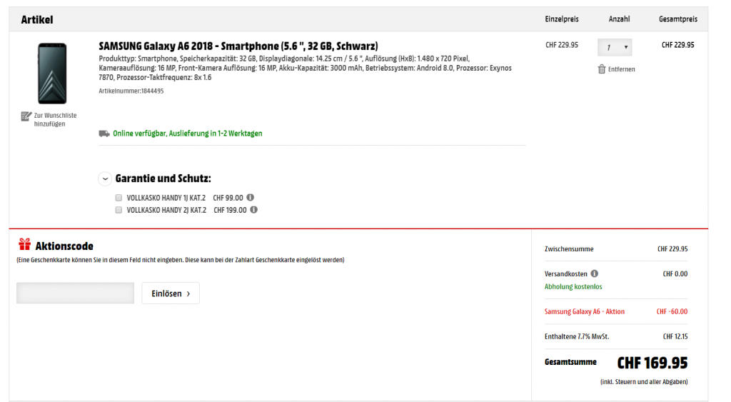 WICHTIG: Der Preis wird erst im Warenkorb korrekt angezeigt - auf der Website steht das Gerät noch für CHF 229 drin. Man benötigt keinen Gutscheincode.