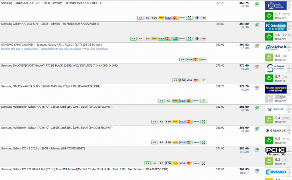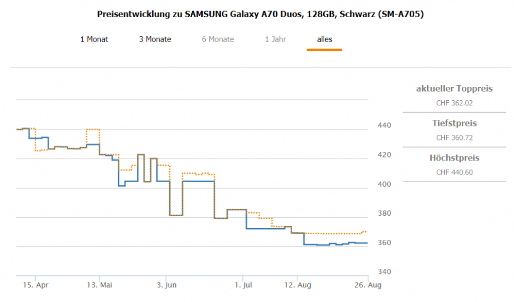 Der Wochenknaller bei Interdiscount ist diese Woche, bis 1. September, das Samsung Galaxy A70 zum neuen Bestpreis von CHF 349.- Der Preis gilt über alle Farben hinweg, zweitbester Preis beträgt CHF 369.75 Bestpreis war bei CHF 360.-
