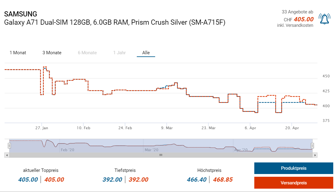 Bei Amazon gibts ein weiteres Samsung Smartphone zu einem guten Preis. Dieses Mal ist es das höherwertige Mittelklasse-Smartphone Galaxy A71. Dieses könnt ihr zum Preis von ca. 333 Euro oder 353 Franken in die Schweiz bestellen. Beachtet jedoch, dass kein Liefertermin angegeben ist, ihr solltet also sicher mit mindestens 2 Wochen rechnen. Bestpreis lag laut toppreise bei 392 Franken.