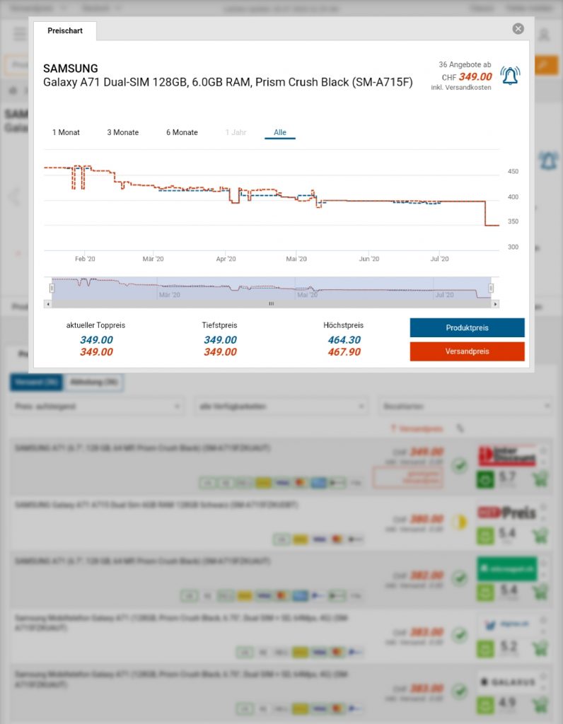 Bei Interdiscount gibts im Rahmen des Jubiläums derzeit dieses Android-Smartphone von Samsung zum neuen Bestpreis vom 349 Franken. Laut der Preispirat-Recherche lag der Preis vor weniger Zeit aber ähnlich tief im Angebot bei Amazon.