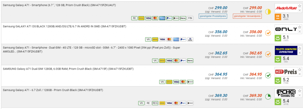 Bei Media Markt gibt es das SAMSUNG Galaxy A71 Smartphone für den neuen Bestpreis von CHF 299.-. Der vorherige Bestpreis war CHF 349.-. Der zweitbeste Preis beträgt CHF 356.-.