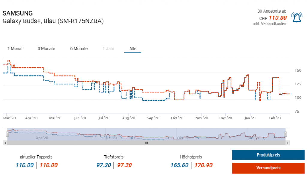 Bei Amazon gibts zurzeit die True Wireless Kopfhörer Galaxy Buds+ von Samsung wieder einmal in Aktion. Dieses Mal gibts die hellblaue Variante zum günstigsten Preis von 70 Franken, die Modelle in Schwarz und Weiss würden etwa 77 Franken inkl. Lieferung kosten.