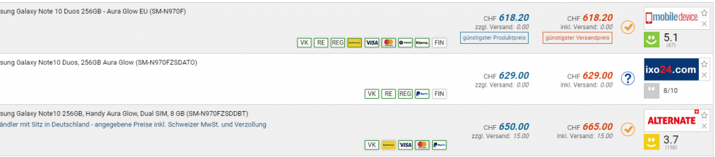 Bei Amazon gibt es momentan das Samsung Galaxy Note 10 für 499.-€ (~CHF 535.-). Der vorherige und auch zweitbeste Preis in der Schweiz liegt bei CHF 618.20.