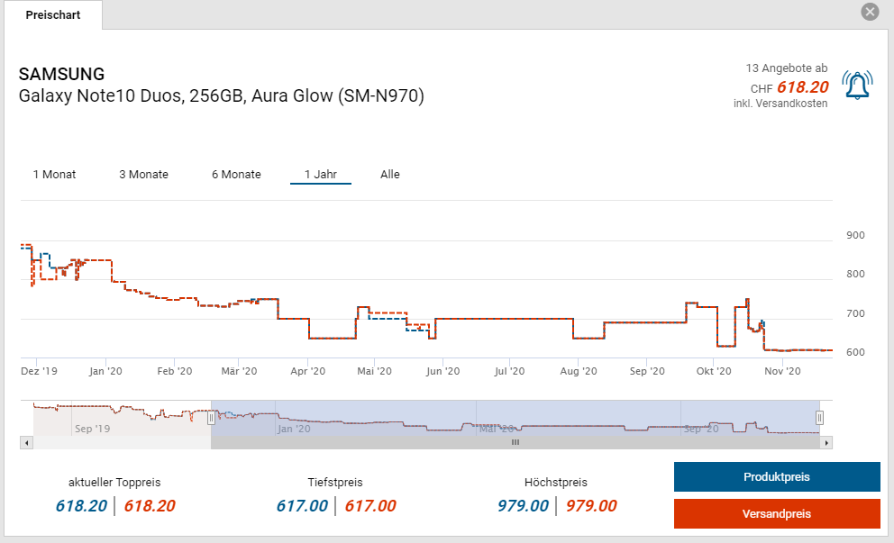 Bei Amazon gibt es momentan das Samsung Galaxy Note 10 für 499.-€ (~CHF 535.-). Der vorherige und auch zweitbeste Preis in der Schweiz liegt bei CHF 618.20.