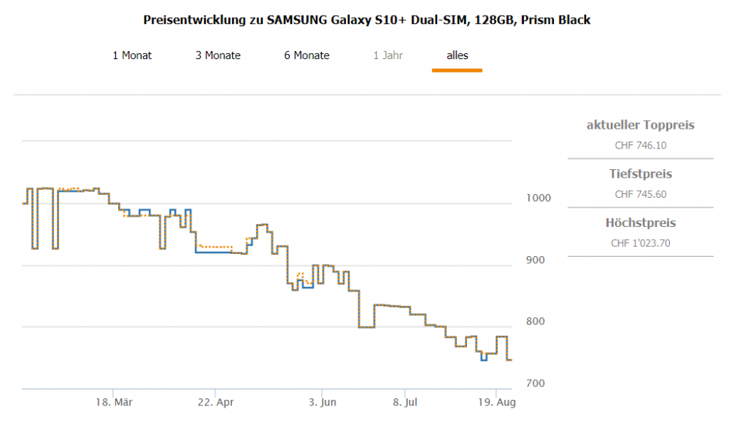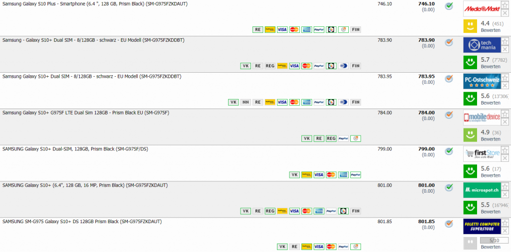 Noch einmal ein Deal aus den Rabatt-Tagen von MediaMarkt. Und zwar gibt’s das SAMSUNG Galaxy S10+ Dual-SIM, 128GB für CHF 746.10. Zweitbester Preis im Moment beträgt CHF 783.90 Bestpreis CHF 756.60
