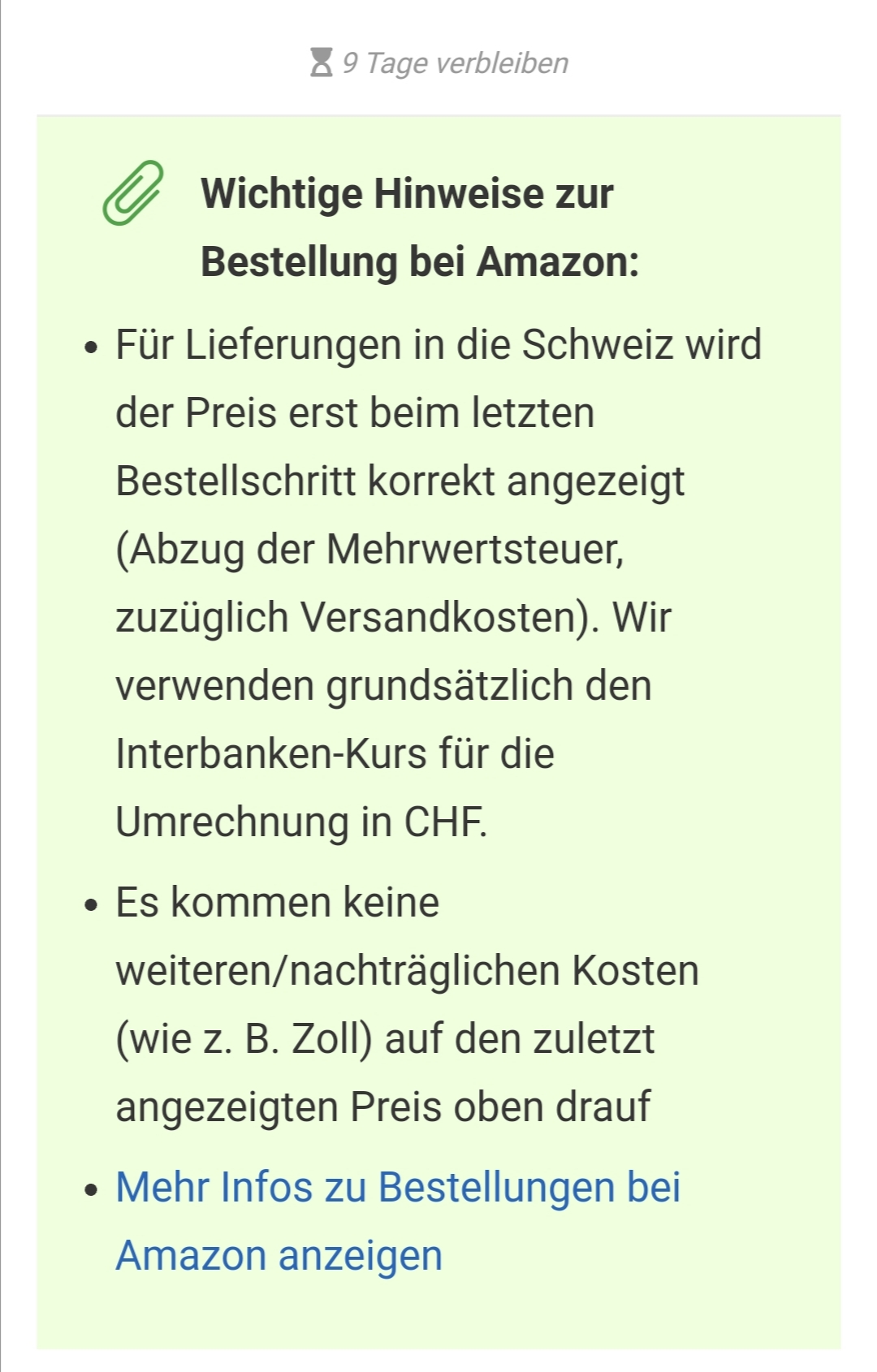 - Für Lieferungen in die Schweiz wird der Preis erst bei Angabe einer Schweizer Lieferadresse richtig angezeigt (Abzug der Mehrwertsteuer, zuzüglich Versandkosten) resp. beim Checkout an der Kasse (Amazon Frankreich, Italien, Spanien und Grossbritannien). Wir verwenden grundsätzlich den Interbanken-Kurs für die Umrechnung in CHF.