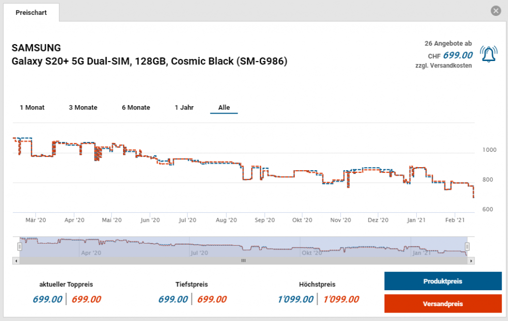 Aktuell gibt es das Samsung S20+ 5G zum Bestpreis von CHF 699.- (zumindest ohne Amazon).