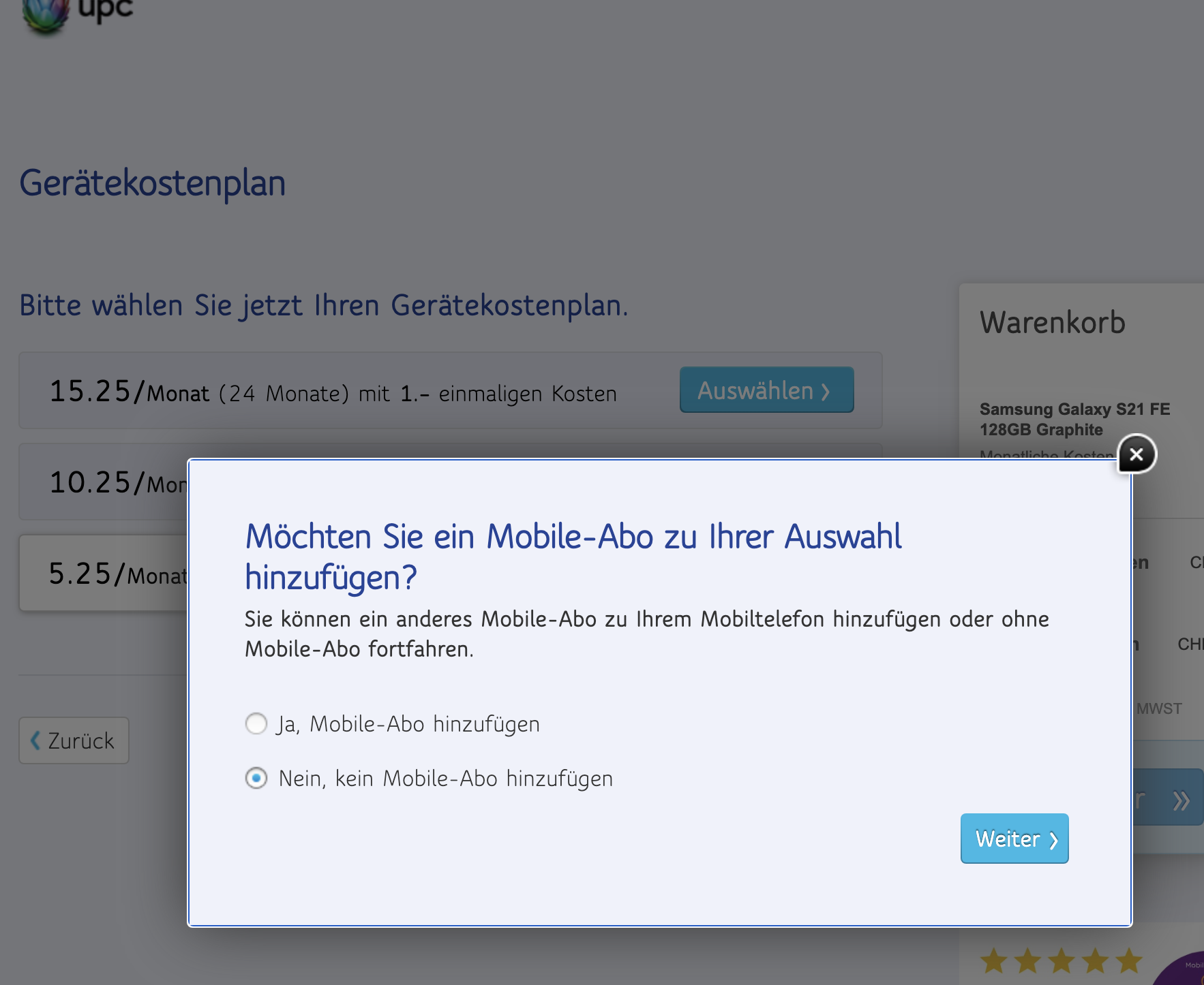 Also ich habe von UPC nur das Internet Abo, kein Mobile Abo. Habe mir am 16.01 zwei S21 FE bestellt und beide am 28.01 geliefert bekommen. Ohne dass ich mir ein UPC Mobile Abo dazunehmen musste. Verwende weiterhin mein bestehendes Mobile Abo von Yallo in dem neuen Handy. War selbst erstaunt dass alles geklappt hat. Einziger Wermutstropfen ist, dass nicht der ganze Betrag bezahlt werden kann. Anzahlung von Fr. 239.- + 24 Monate * 5.25 = Fr. 126. Gibt Total Fr. 365.- (keine Ahnung wieso die auf der Website 369 schreiben, ist aber auch egal). Top Deal!