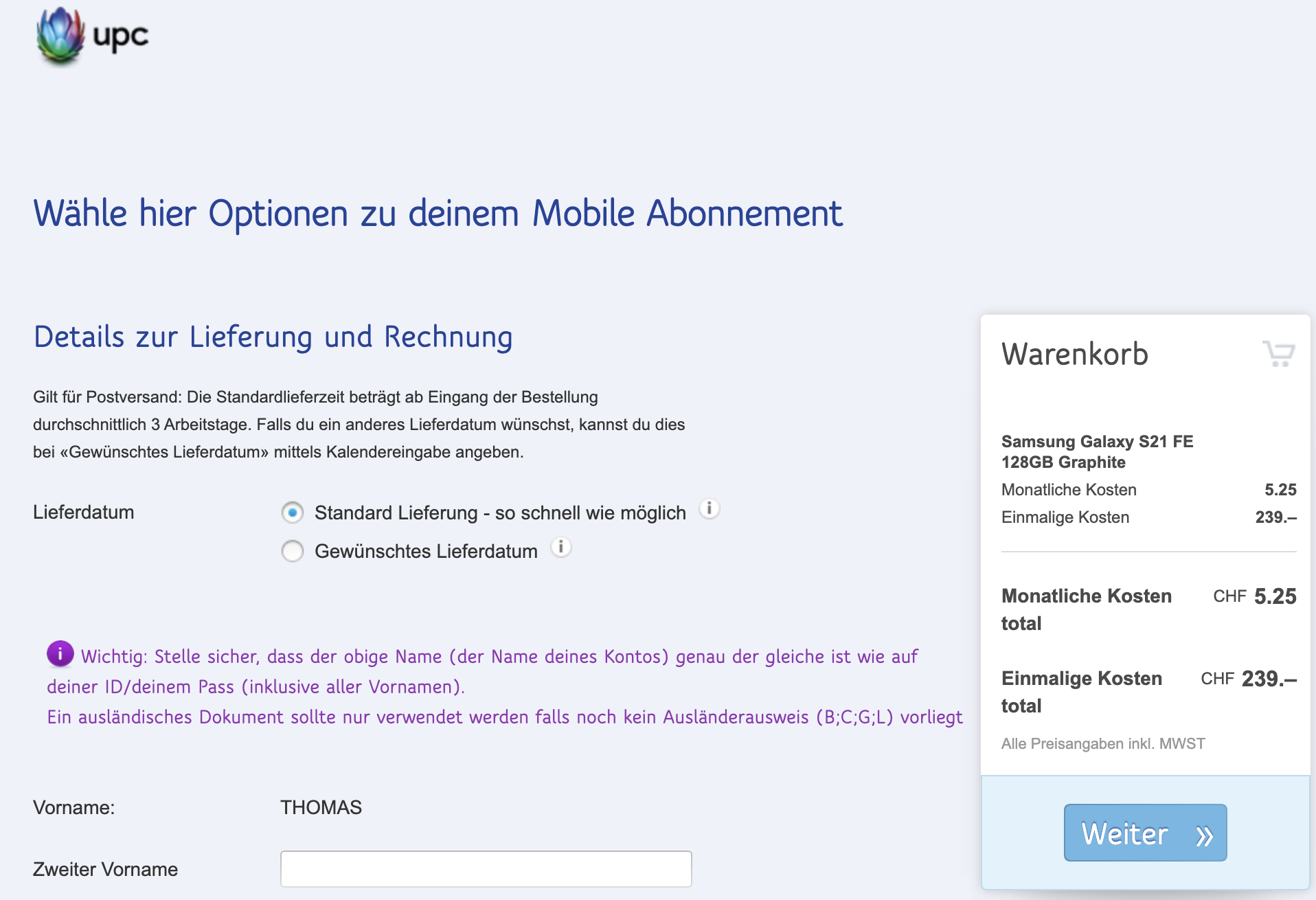 Übrigens wurden beide Geräte (S21 FE und A52s) vor rund zwei Wochen geliefert, obwohl ich nur Internet 600 über UPC habe und kein Mobileabo...