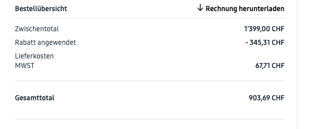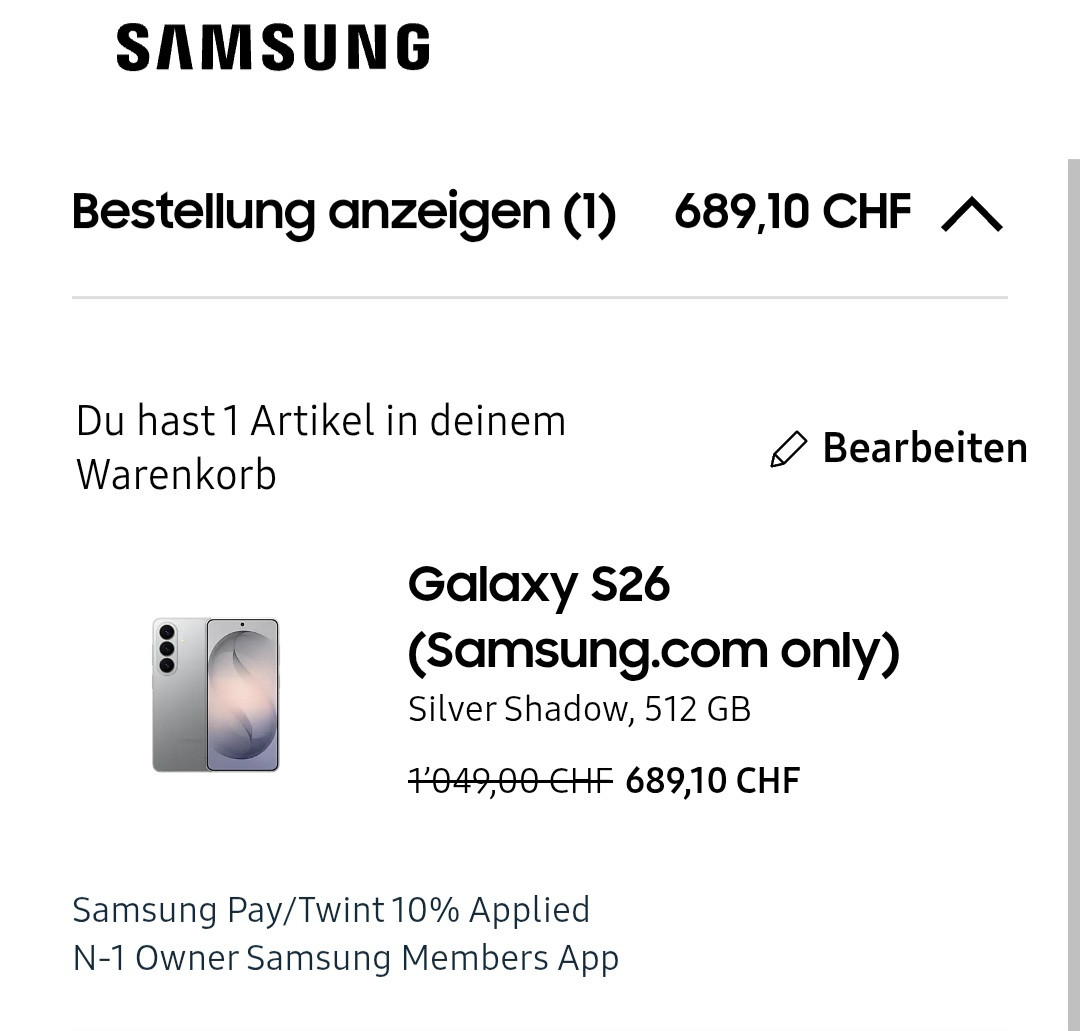 Die 10% bei Zahlung mit Twint oder SamsungPay sind kein Fehler, sondern werden in der Samsung "Members"-App explizit so beworben. Angebot gültig bis 10.03.2026.