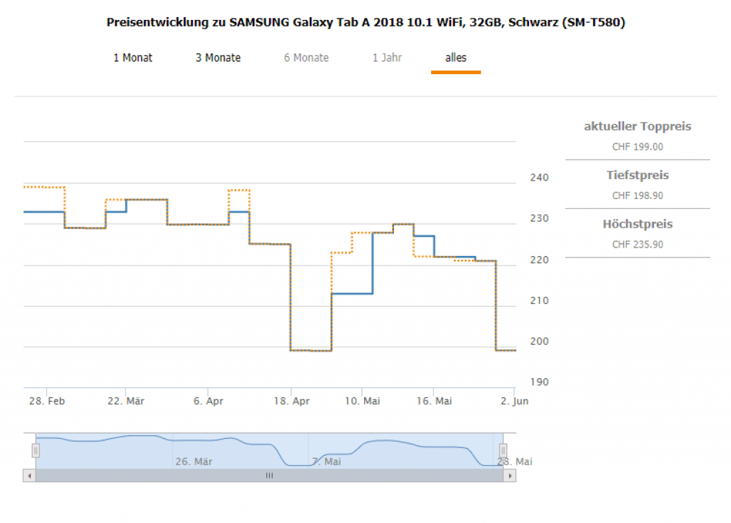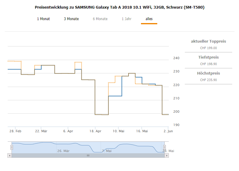 Der zweitbeste Preis aktuell liegt bei 220.90 CHF. günstiger als für 198.90 gab es das Gerät noch nie.