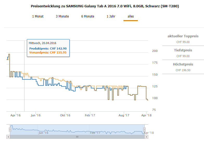 Das Galaxy Tab A gab es bis jetzt noch nie unter 99 CHF. Der Zweitbeste Preis aktuell liegt bei 101.20 CHF.