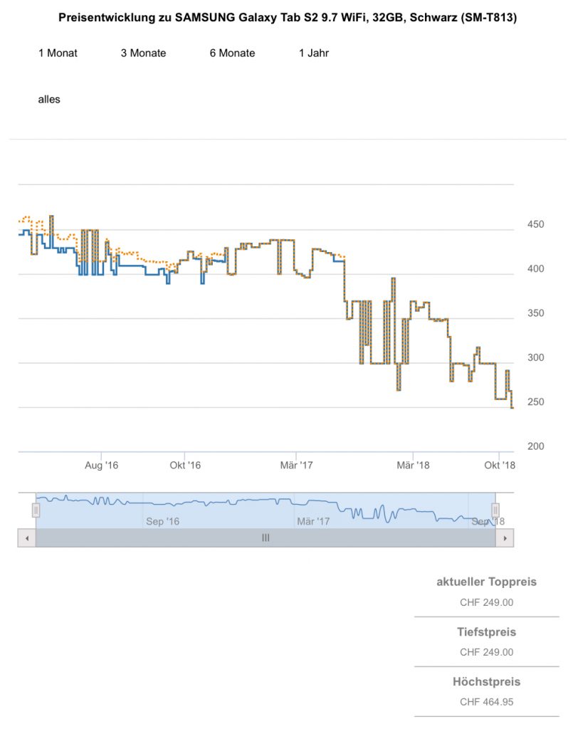 Gemäss toppreise war der best price über alle Farben bislang bei 258.95 CHF, der zweitbeste Preis sind aktuell 251.90 CHF für das Tablet in Gold (10% auf alle Geräte bei interdiscount).