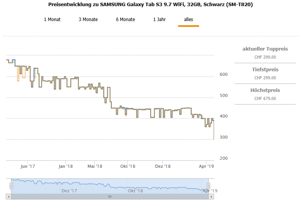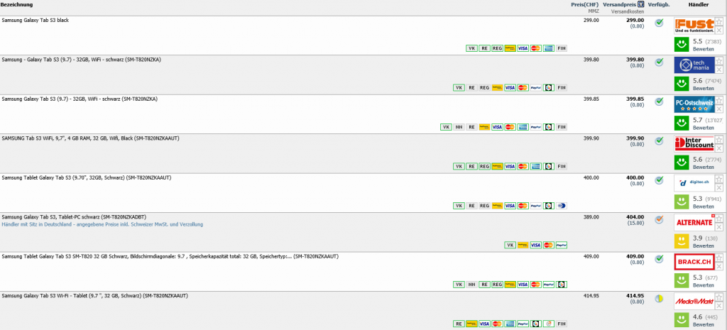 Bei Fust gibt es aktuell das SAMSUNG Galaxy Tab S3 9.7 WiFi, 32GB, Schwarz für 299.- CHF. Mit Code 1119RM kommt ihr auf einen Endpreis von 279.- CHF. Zweitbester Preis sind 399.- CHF.