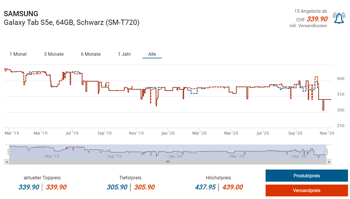 Bei Amazon.de gibts derzeit das Samsung Galaxy Tab S5e mit 4GB RAM und 64GB Massenspeicher zum Aktionspreis von 299 Franken. Laut toppreise übertrifft dies somit den bisherigen Bestpreis von knapp 306 Franken. edit: Scheinbar war es letztes Jahr für CHF 289.90 verfügbar.