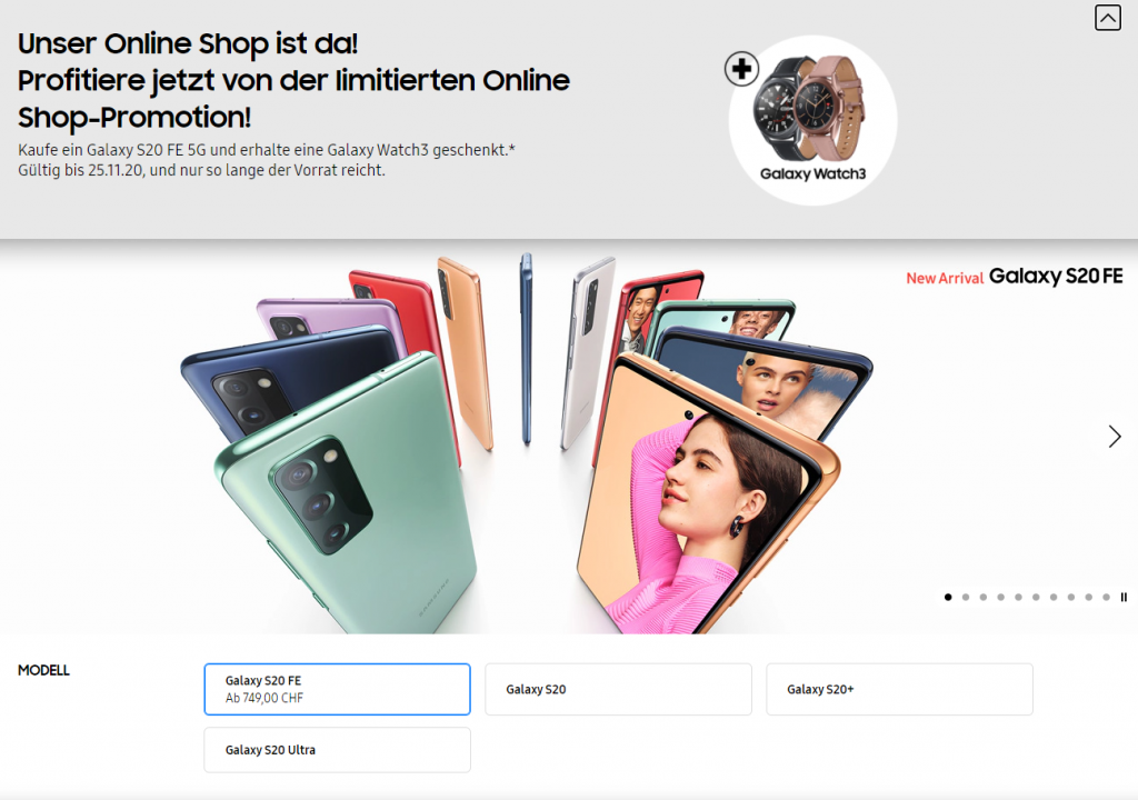 Es gibt momentan zum Start des Onlineshops von Samsung jeweils ein Samsung Galaxy Watch 3 gratis zum Samsung Galaxy s20 FE 5G dazu.