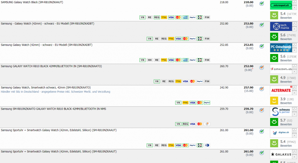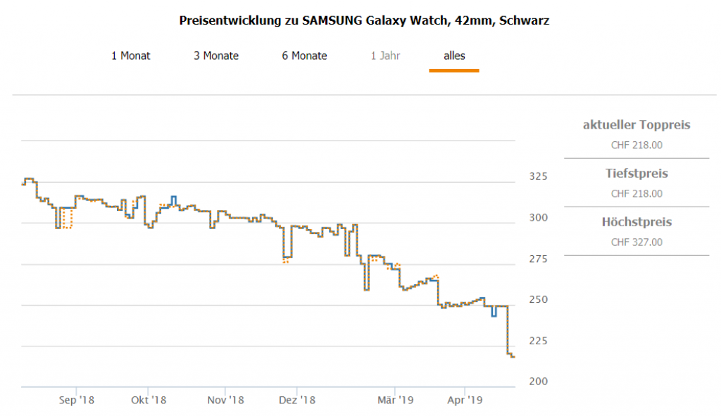 Bei microspot gibt’s gerade die SAMSUNG Galaxy Watch, 42mm, Schwarz für CHF 218.- Der zweitbeste Preis beträgt CHF 252.80 Bis vor wenigen Tagen gab es die Smartwatch in dieser Version nie unter CHF 249.-