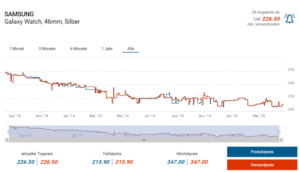 Bei Amazon gibts gerade die Samsung Galaxy Watch in der 46mm-Variante zum neuen Bestpreis. Laut toppreise lag dieser nach dem Black Friday 2019 bei CHF 215.90, zurzeit müsste man fast 227 Franken dafür zahlen.