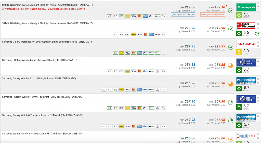 Bei microspot gibt’s die SAMSUNG Galaxy Watch Midnight Black für CHF 197.10 wenn man beim Checkout den Gutscheincode SAM10 eingibt. Bestpreis war am 12.12. für CHF 197.90, zweitbester Preis beträgt CHF 219.-