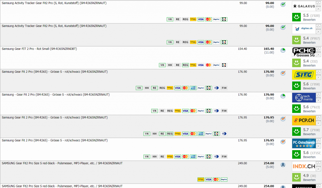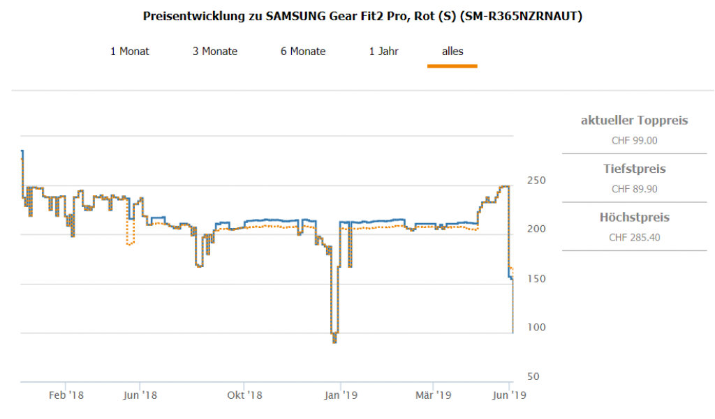 Bei digitec/galaxus erhält man gerade das Samsung Gear Fit2 Pro für CHF 99.- Zweitbester Preis in der Schweiz liegt momentan bei CHF 165.40, Bestpreis war letzte Weihnachten bei CHF 89.90, seither und auch davor aber weit weg von diesem Niveau.