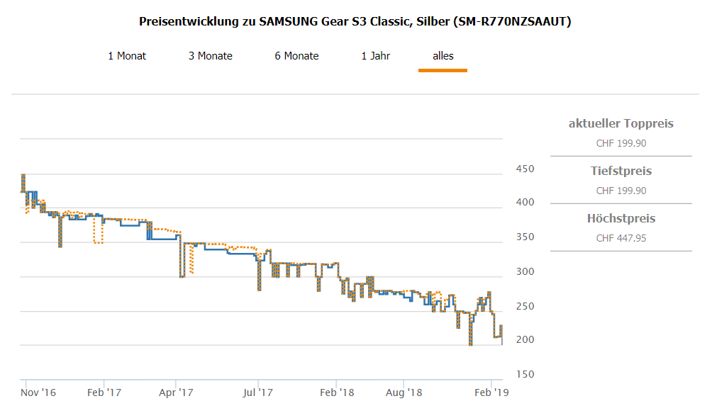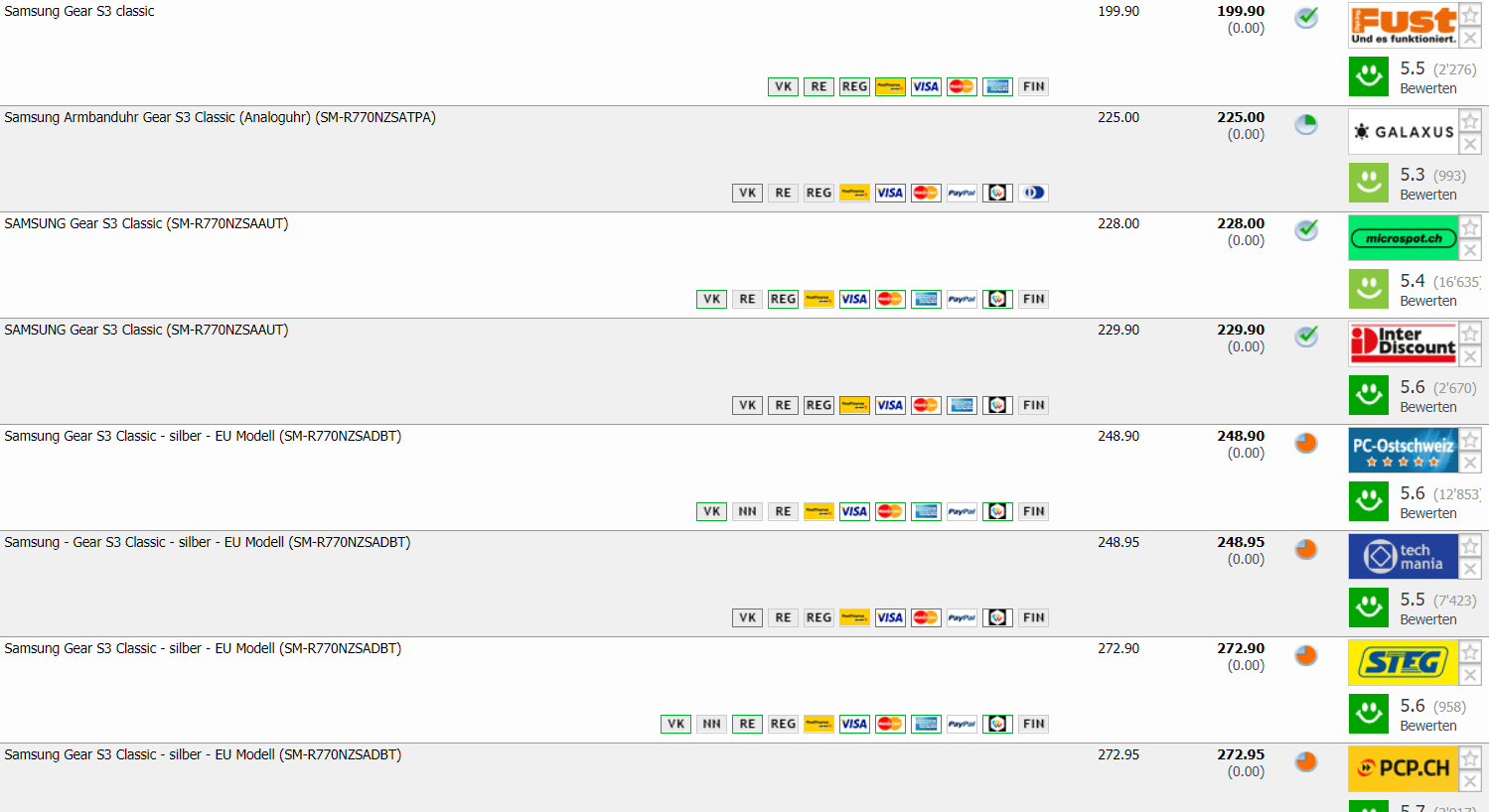 Bei FUST gibt’s die SAMSUNG Gear S3 Classic für CHF 199.90 mit Gutscheincode 1119RM sogar noch 20.- günstiger für CHF 179.90 Der zweitbeste Preis beträgt im Moment CHF 225.- Bestpreis war laut toppreise bei CHF 199.90