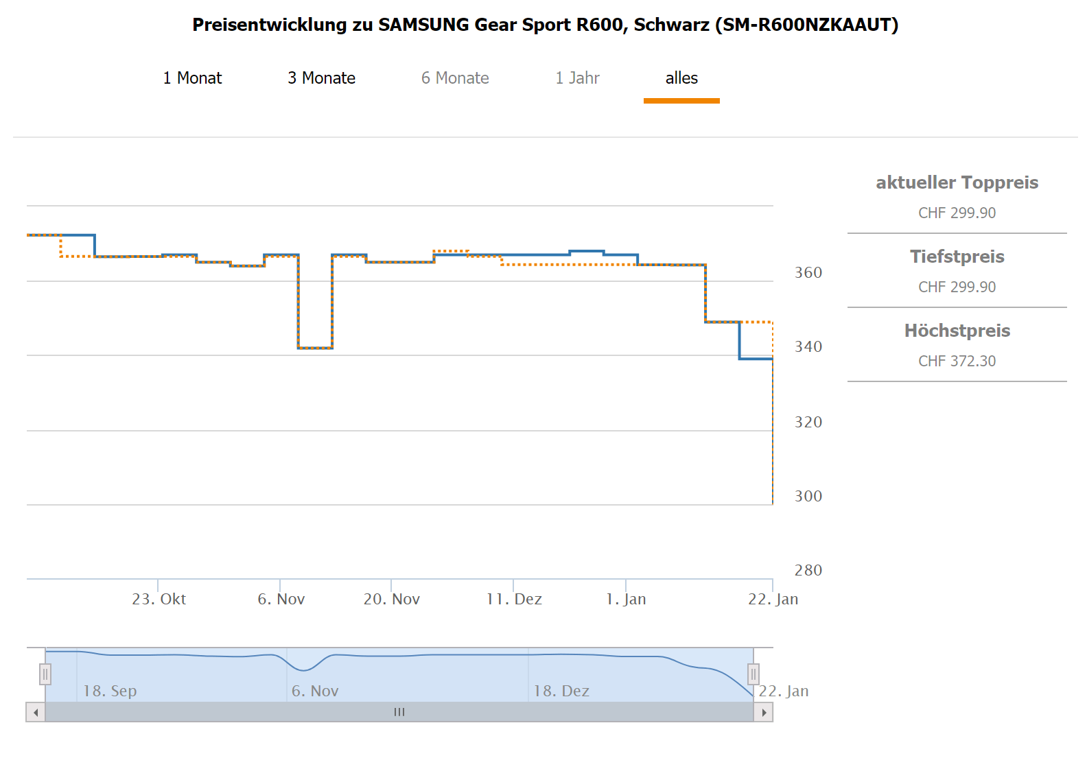 Ende letzten Jahres hat Samsung ihre Sport Smartwatch Gear Sport R600 vorgestellt. Und bereits wenige Monate später purzelt der Preis. Bei Interdiscount gibt’s die Sportsmartwatch nun für knapp 300 Franken, somit spart man fast 50 Franken auf den zweitbesten Preis in der Schweiz bei PC-Ostschweiz. Bei Manor und melectronics kostet die Uhr sogar noch CHF 379.- Die Uhr ist in den Farben schwarz und blau verfügbar.
