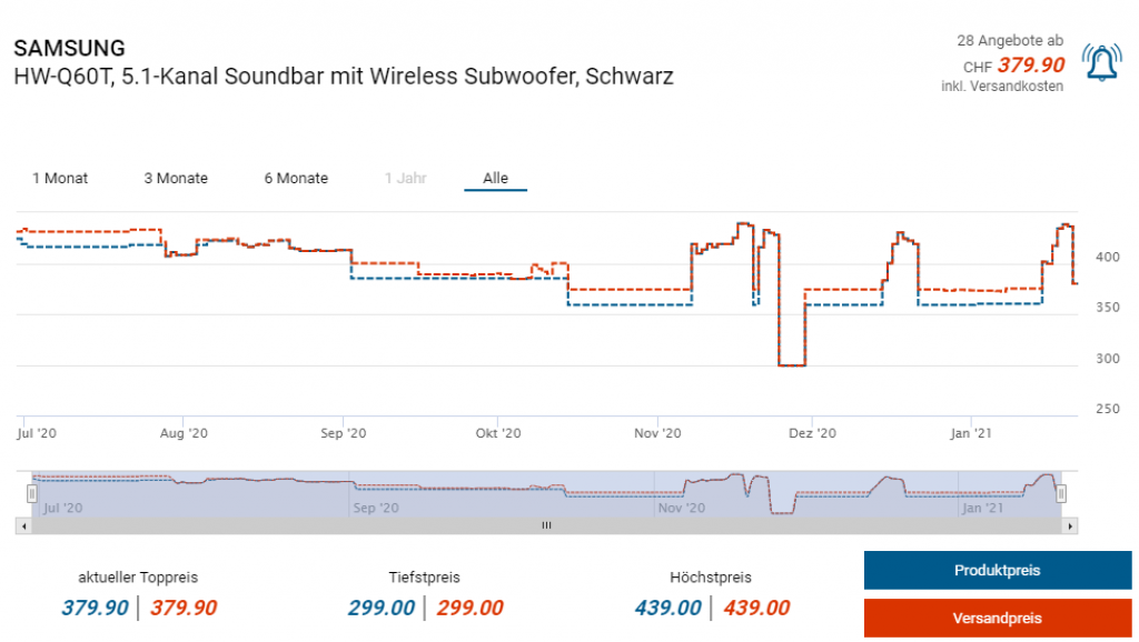Bei Daydeal gibts iom Deal of the week die 5.1.2 Soundbar HW-Q60T von Samsung zum Aktionspreis von 299 Franken. Laut toppreise soll der Vergleichspreis bei 379.90 Franken liegen. Laut Preispirat-Recherche gabs diese Soundbar am Black Friday bereits bei melectronics für 289 Franken.