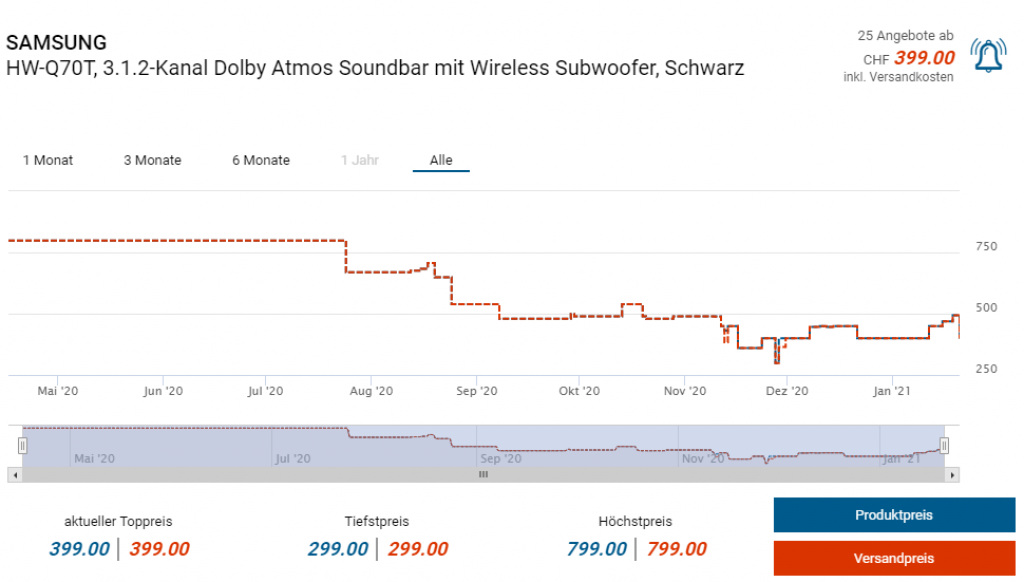 Bei Fust gibts derzeit die 3.1.2 Soundbar HW-Q70T zum Aktionspreis von 399 Franken. Mit dem blackfridaydeals-Gutschein spart ihr nochmal weitere 20 Franken. Der Vergleichspreis liegt laut toppreise momentan bei 498 Franken, wobei der Bestpreis schon einmal bei 299 Franken war.