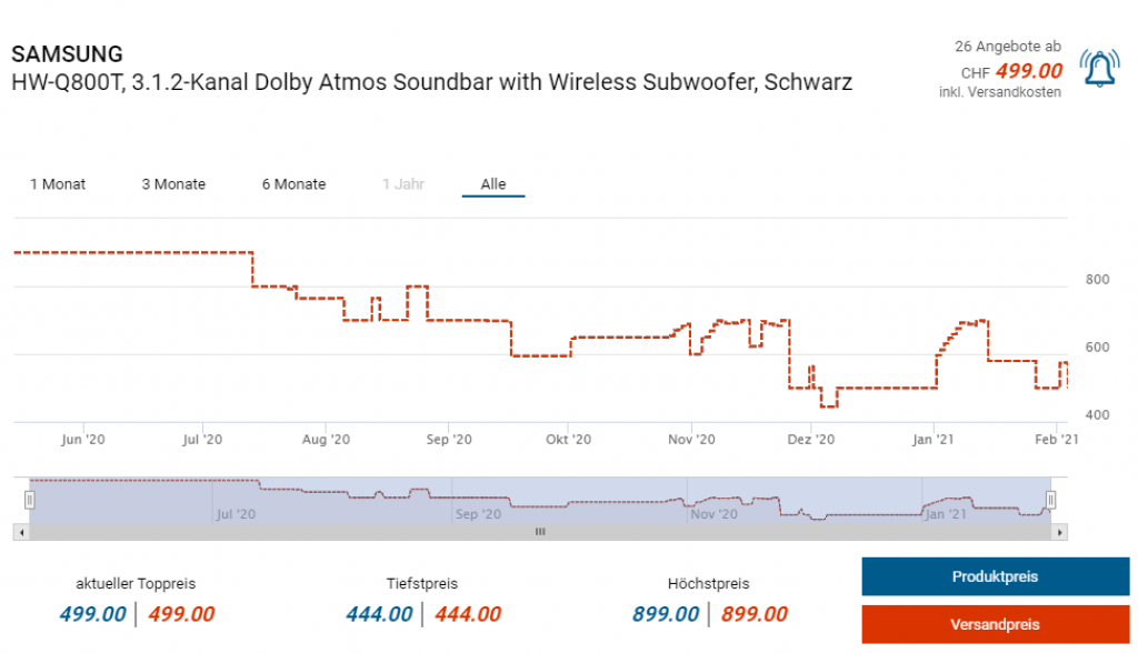Bei Mediamarkt gibts derzeit die Dolby Atmos Soundbar HW-Q800T von Samsung zum Preis von CHF 509.15. Laut toppreise lag der Bestpreis zwar schon bei CHF 444.- am Black Friday, zurzeit stellt es aber sicher ein interessantes Angebot dar.