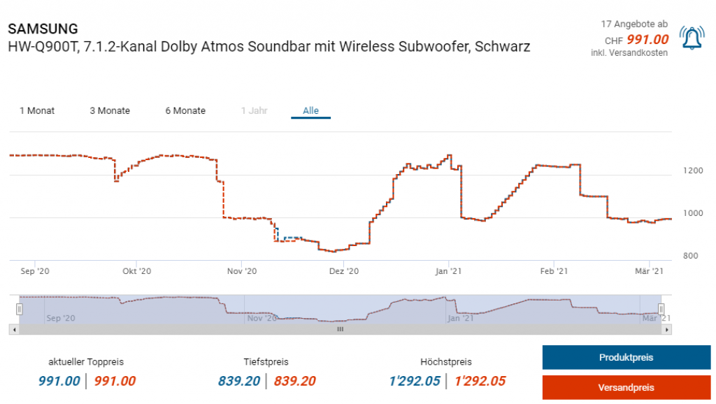 Bei Daydeal gibts derzeit noch bis 9 Uhr die Dolby Atmos Soundbar HW-Q900T zum neuen Bestpreis von 799 Franken. Laut toppreise soll der bisher tiefstgemessene Preis bei knapp 840 Franken gelegen haben, ansonsten kostet die Soundbar zurzeit aber über 991 Franken.