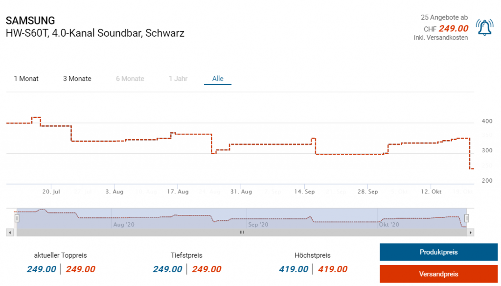 Bei melectronics gibts diese Woche die 4.0 Soundbar HW-S60T von Samsung zum Aktionspreis von 249 Franken. Wenn man sich vorgängig zum Newsletter bei melectronics anmeldet spart man sich zudem nochmal 10 Franken. Den zweitbesten Preis gibts derzeit bei amazon.fr für knapp 290 Franken.