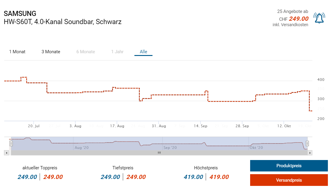 Bei melectronics gibts diese Woche die 4.0 Soundbar HW-S60T von Samsung zum Aktionspreis von 249 Franken. Wenn man sich vorgängig zum Newsletter bei melectronics anmeldet spart man sich zudem nochmal 10 Franken. Den zweitbesten Preis gibts derzeit bei amazon.fr für knapp 290 Franken.