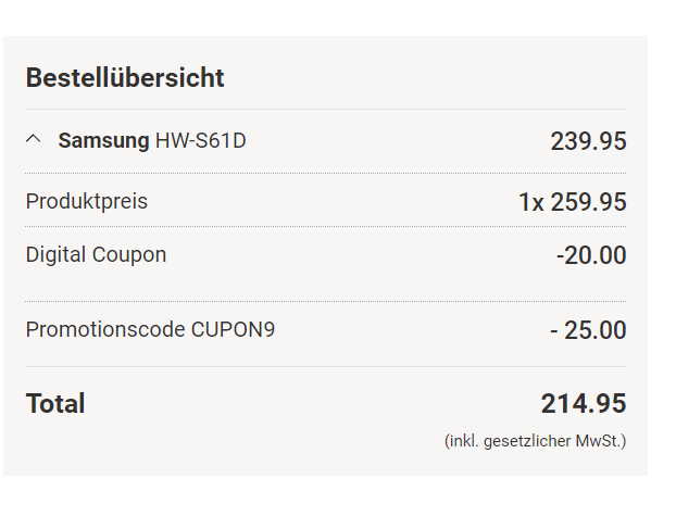 Den SAMSUNG HW-S61D (2024) 5.0-Kanal Dolby Atmos Soundbar gibt es jetzt bei Fust zum neuen Bestpreis von 214.95 Franken. Um diesen Preis zu erhalten, müsst ihr den passenden Rabattcode anwenden. Zusätzlich könnt ihr in der Supercard-App den Bon aktivieren und weitere 20.- Franken sparen.
