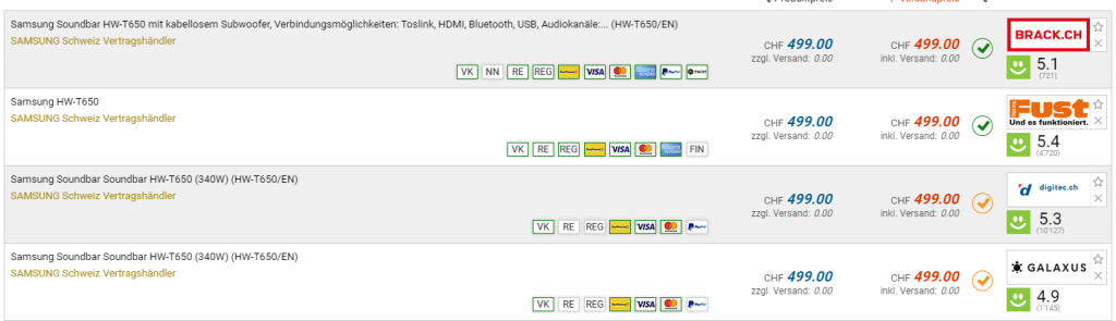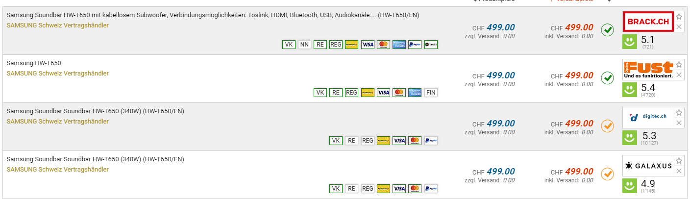 Bei DayDeal gibt es heute die Samsung HW-T650 Soundbar für den neuen Bestpreis von CHF 249.-. Der vorherige Bestpreis war CHF 424.-. Der zweitbeste Preis beträgt CHF 499.-.