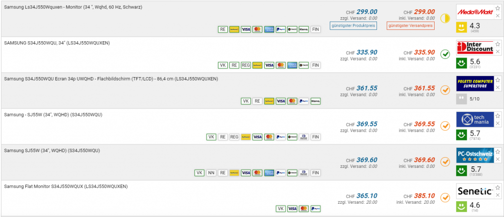 Bei Media Markt gibt es momentan den SAMSUNG LS34J550WQUXEN - Monitor zu dem neuen Bestpreis von CHF 299.-. Der vorherige Bestpreis lag bei CHF 321.30. Der zweitbeste Preis beträgt CHF 335.90 bei Interdiscount.