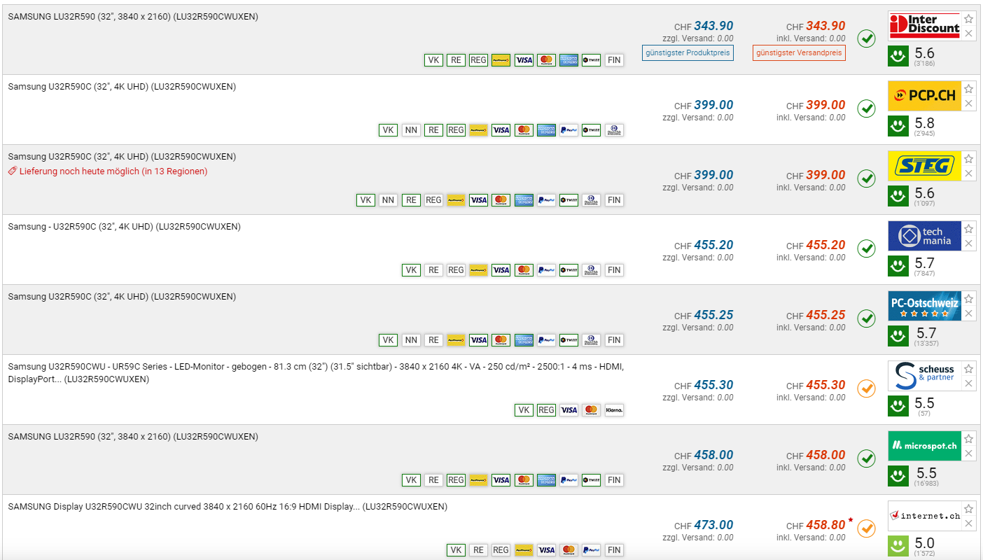 Bei Interdiscount gibt’s gerade den SAMSUNG LU32R590 32“ PC-Monitor mit einer Auflösung von 3840 x 2160 für CHF 343.90 Zweitbester Preis beträgt CHF 399.- Bestpreis war bei CHF 398.-