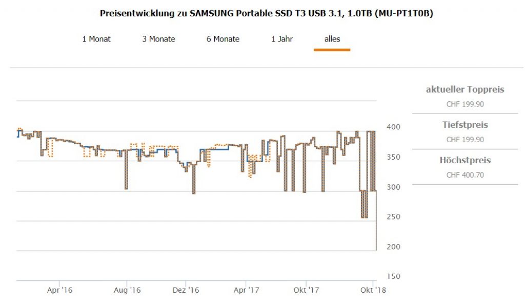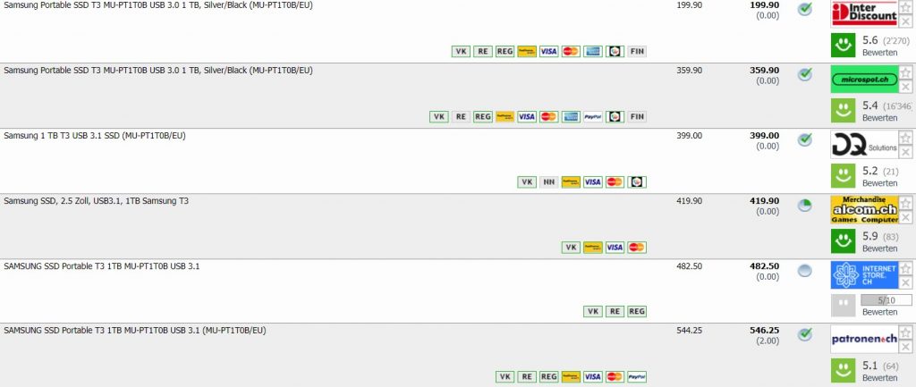 Bei Interdiscount erhält man gerade die portable SSD Festplatte SAMSUNG Portable SSD T3 USB 3.1, 1.0TB für CHF 199.90. Mit dem Gutscheincode HFWID10 sogar für CHF 189.90 Bisheriger Bestpreis betrug CHF 254.90 Momentan beträgt der zweitbeste Preis CHF 359.90