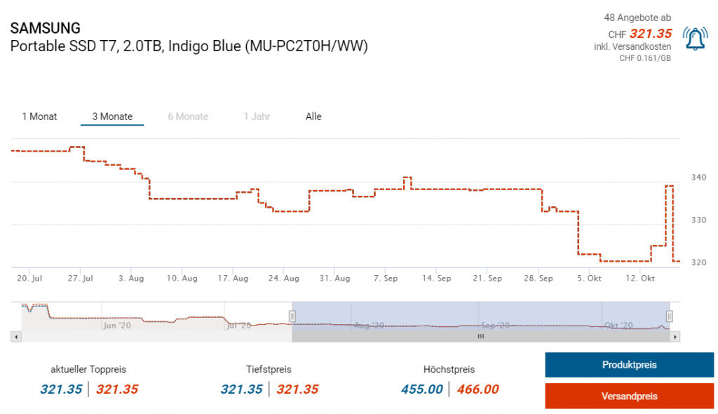 Bei Daydeal gibts heute die portable SSD T7 von Samsung in der 2TB-Ausführung zum Aktionspreis von 289 Franken. Wenn ich mich nicht täusche gabs die aber günstiger am Prime Day bei Amazon.