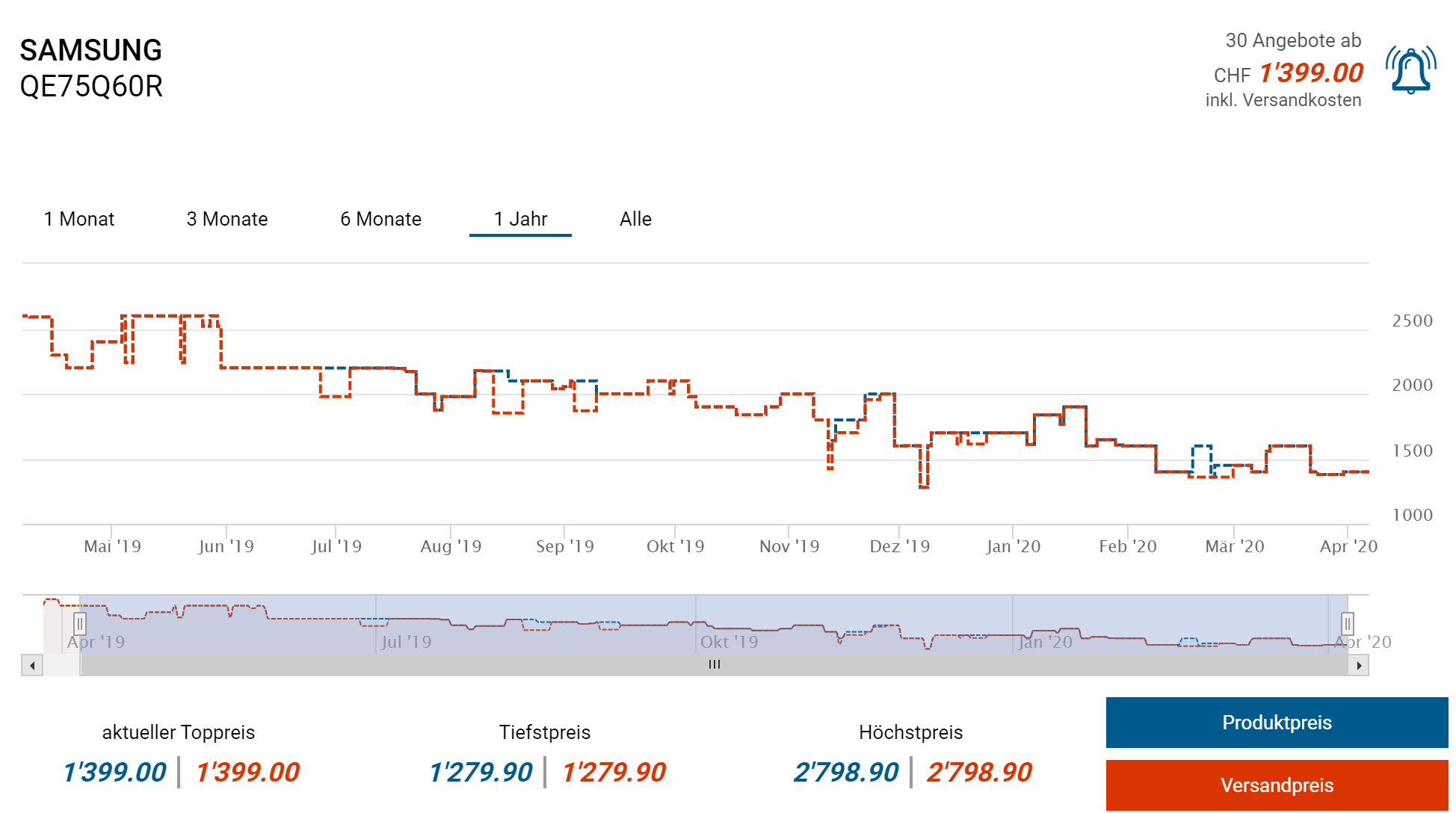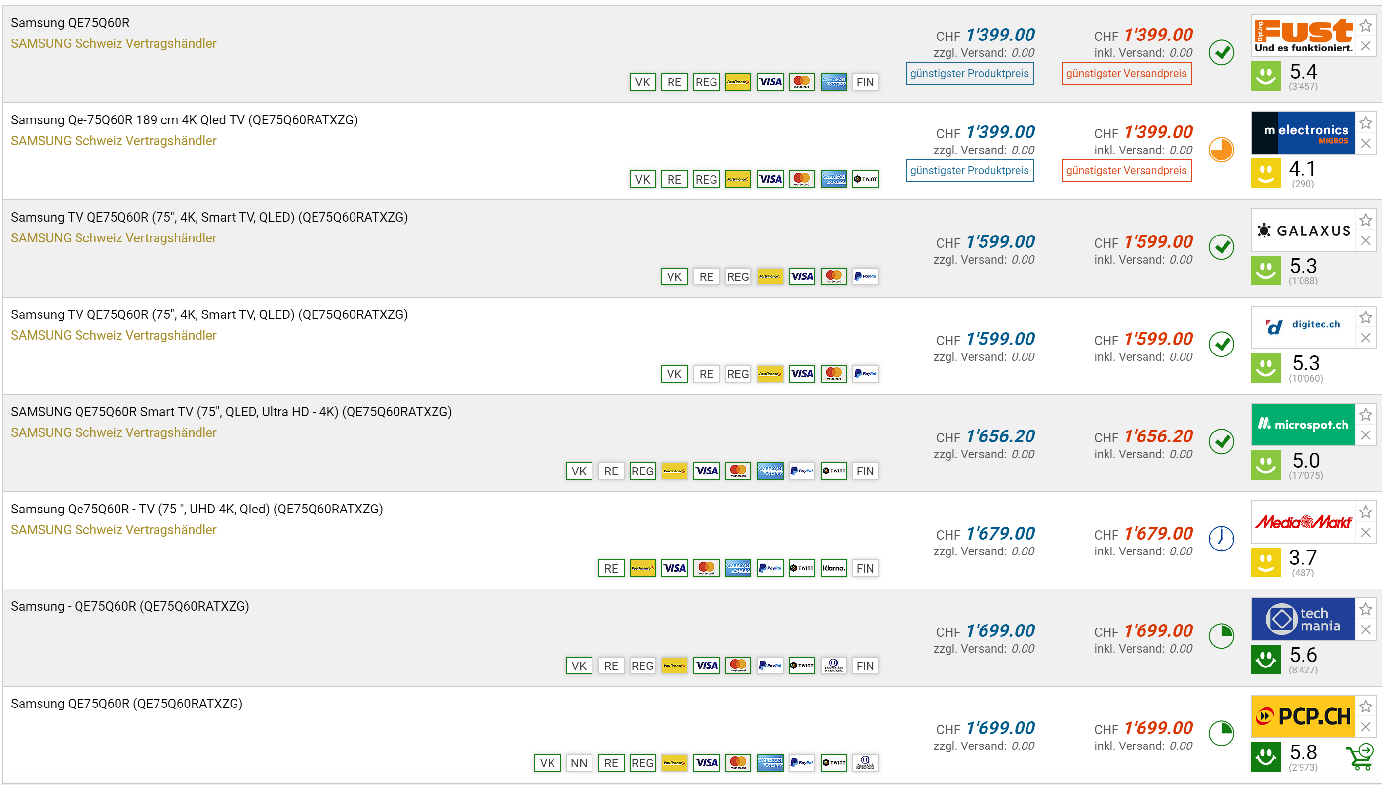 Bei melectronics gibt’s den 75” QLED TV Samsung QE-75Q60R für CHF 1179.15, wenn man den Gutscheincode 15%tv mit dem Newsletter-Anmeldungs-Gutschein kombiniert. Lieferdauer: Ca. 2 Wochen. Zweitbester Preis: CHF 1399.- Bestpreis laut toppreise: CHF 1279.-