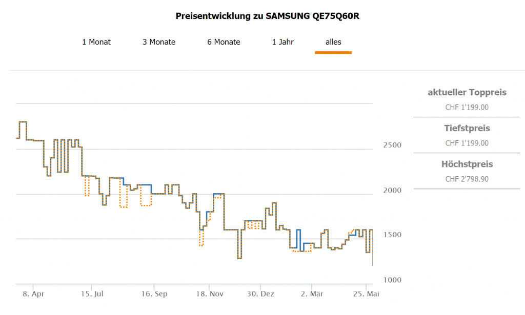 Wieder einmal ein recht günstiger 75“ 4K TV bei melectronics. Den Samsung QE-75Q60R gibt’s für CHF 1199.- Mit dem Gutscheincode, den man für die Newsletter-Anmeldung erhält, kostet der TV noch CHF 1189.- Zweitbester Preis laut toppreise liegt bei CHF 1599.- Bestpreis laut toppreise bei CHF 1279.-