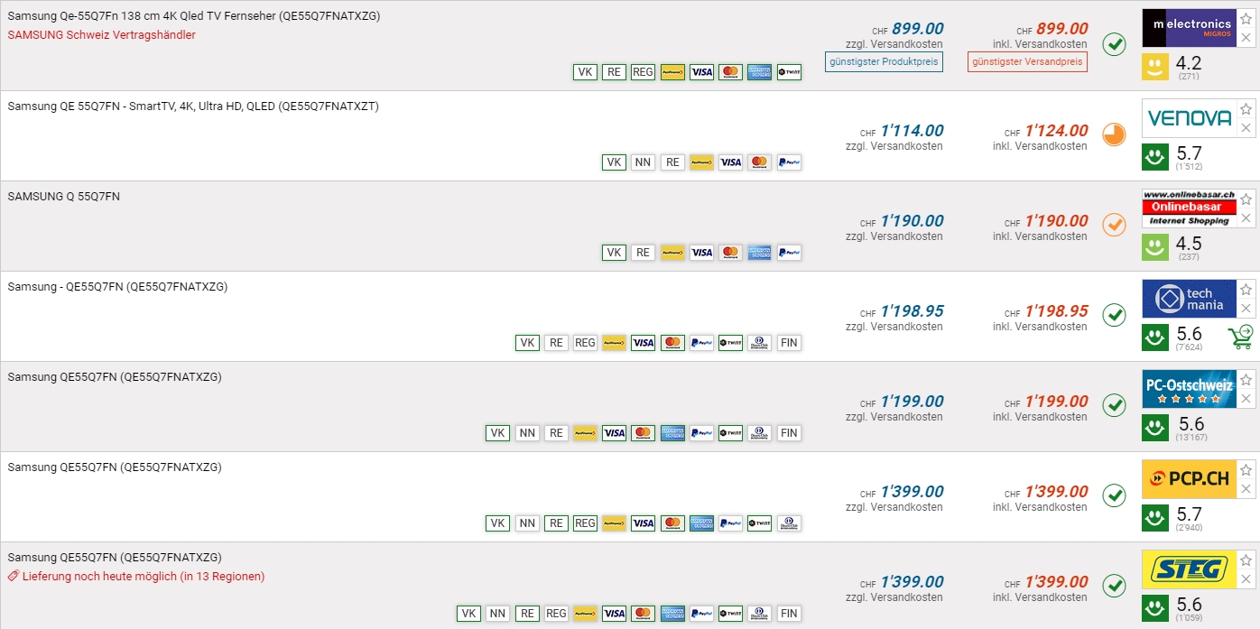 Bei Meletronics bekommt man momentan den SAMSUNG QE55Q7FN– TV (55 „, UHD 4K, LCD/QLED) für CHF 899.- Bisheriger Bestpreis war CHF 999.- Zweitbester Preis im Moment beträgt CHF 1’124.-