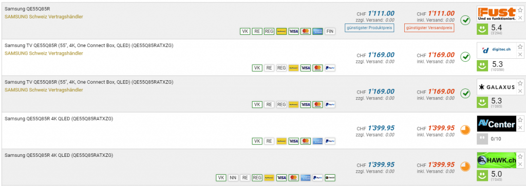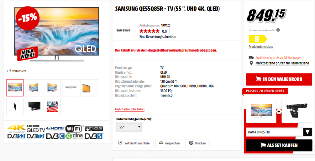 Bei Media Markt gibt es den SAMSUNG QE55Q85R Fernseher für den neuen Bestpreis von CHF 849.15. Der vorherige Bestpreis war CHF 999.-. Der zweitbeste Preis beträgt CHF 1111.-.