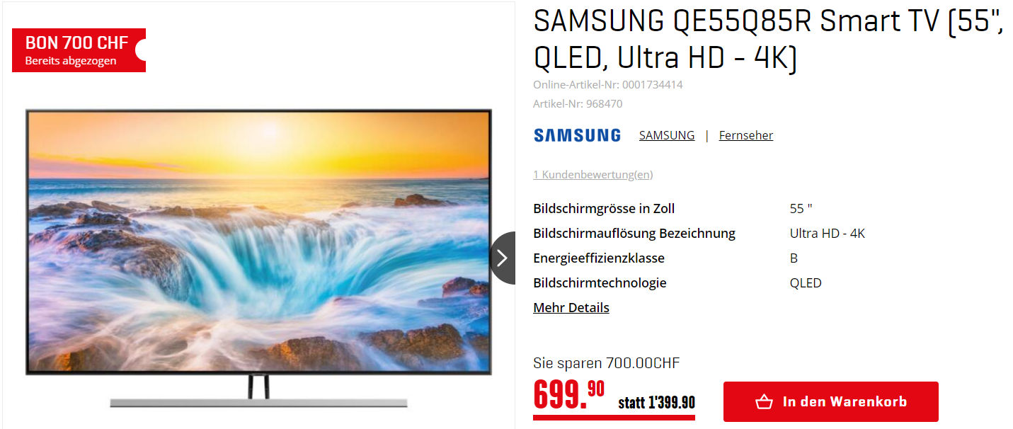 Aktuell gibt es den SAMSUNG QE55Q85R (55″, QLED, Ultra HD – 4K) für nur CHF 699.90 bei Interdiscount.