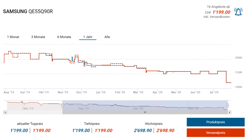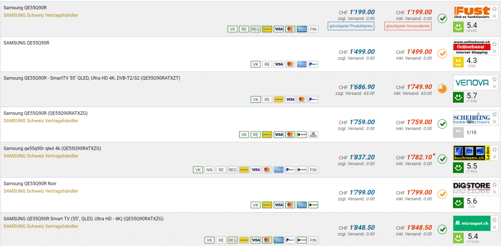 Bei Fust gibt’s gerade den SAMSUNG QE55Q90R für CHF 1199.- Mit dem Code 0620RM wird’s nochmals 20.- günstiger. Zweitbester Preis ist bei CHF 1499.- laut toppreise. Scheint auch neuer Bestpreis zu sein.