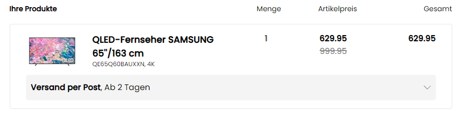 Bei Conforama könnt ihr euch derzeit den QLED-Fernseher Samsung QE65Q60B zum neuen Bestpreis für 629.95 Franken sichern! Laut Recherche liegen die Vergleichspreise sonst bei 699 Franken.