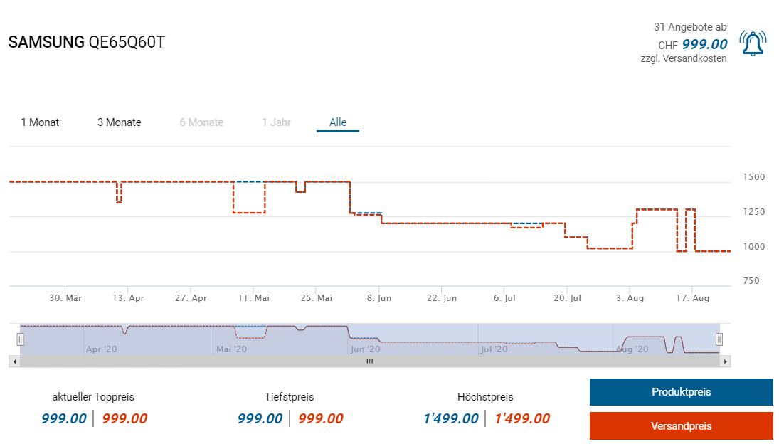 Beim Blickdeal gibts diese Woche den 65 Zoll grossen QLED-Fernseher der 2020er-Serie von Samsung, dem QE65Q60T zum neuen Bestpreis von 899 Franken. Den zweitbesten Preis gibts derzeit bei Fust für CHF 999.-