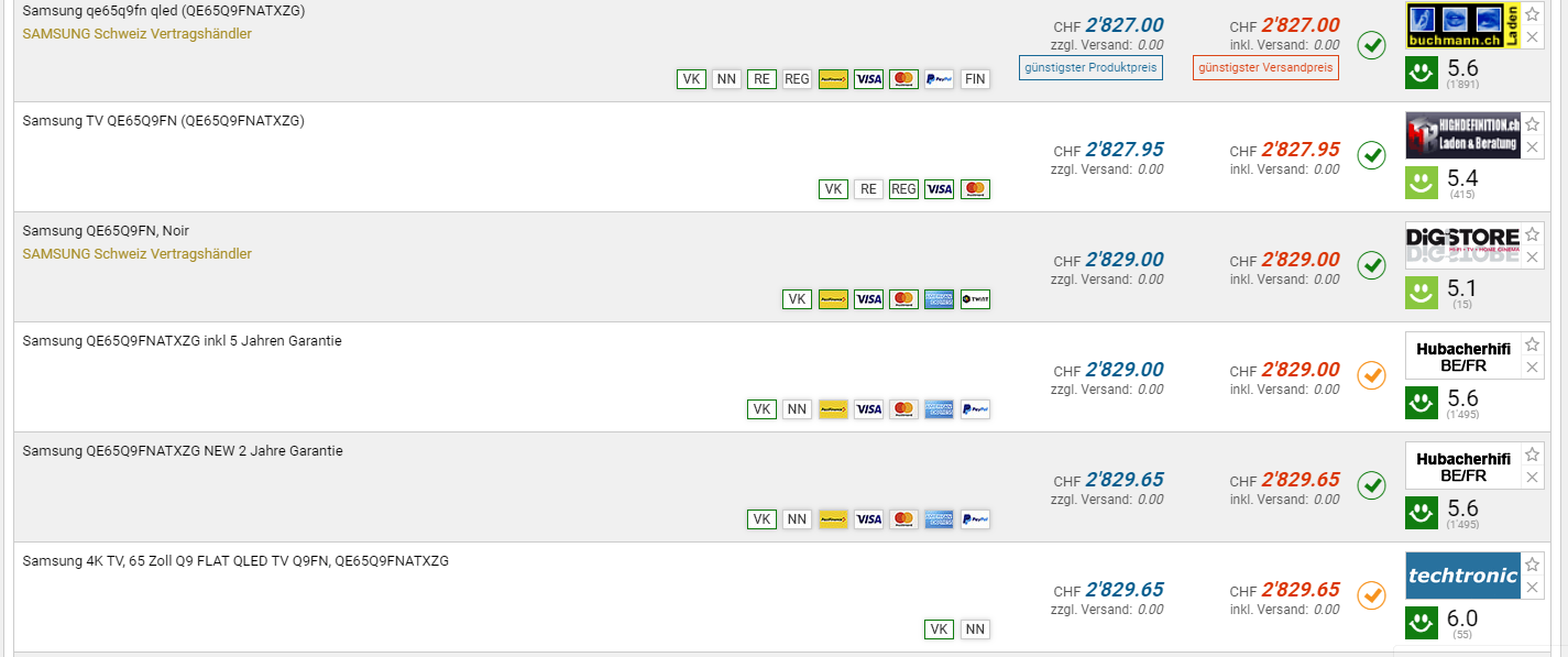 Bei digitec gibt es momentan den Samsung QE65Q9FN Fernseher für den Bestpreis von CHF 1999.-. Zuletzt war der Preis im Juni so niedrig. Der zweitbeste Preis beträgt CHF 2827.-.